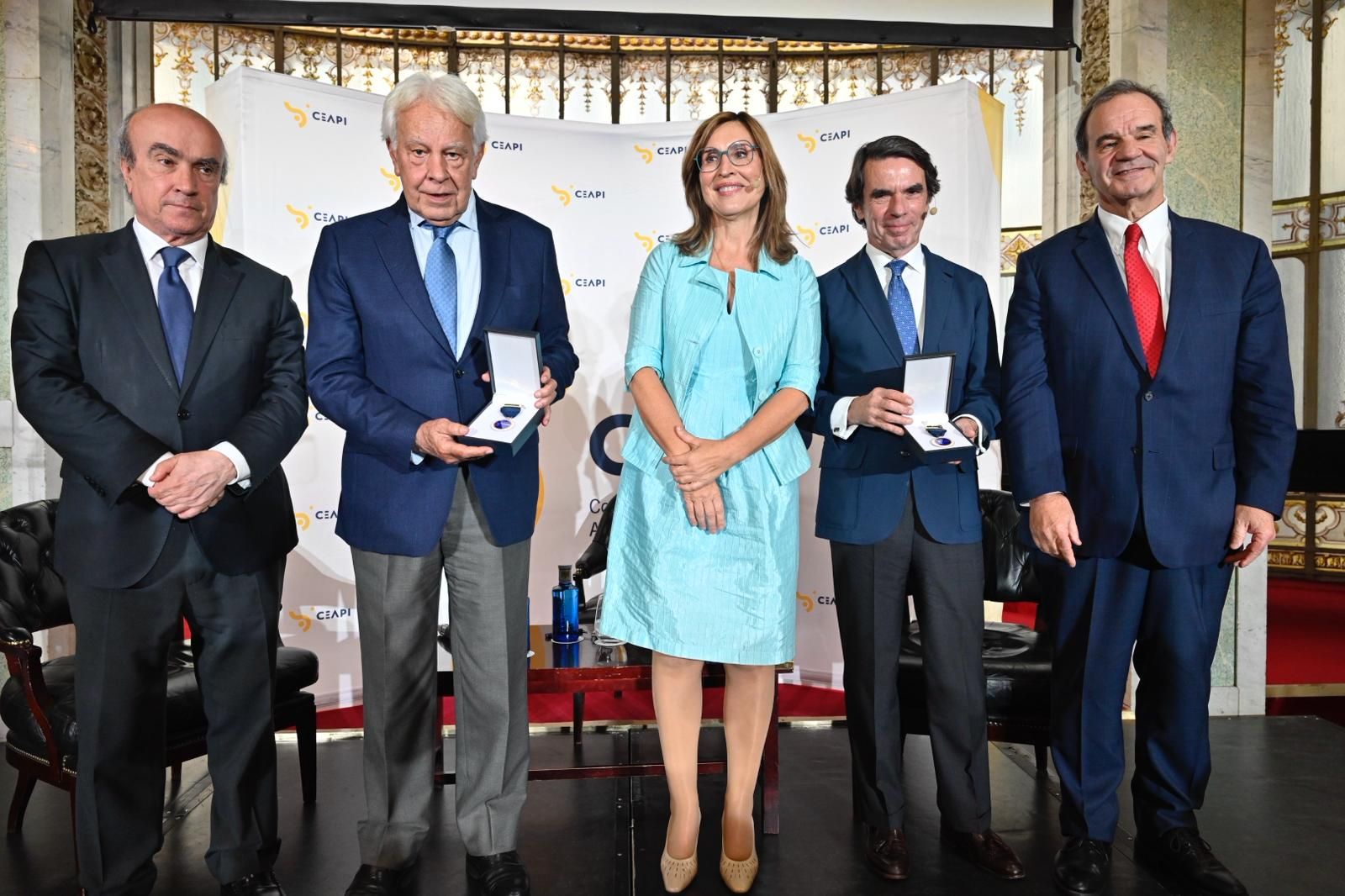 El Consejo Empresarial Alianza por Iberoamérica (CEAPI) entregó en Madrid las Medallas de Honor a los expresidentes del Gobierno de España, Felipe González (1982-1996) y José María Aznar (1996-2004), en reconocimiento a su labor en el fortalecimiento de las relaciones entre España y los países iberoamericanos, así como su impulso a los avances democráticos, económicos y sociales en la región.
