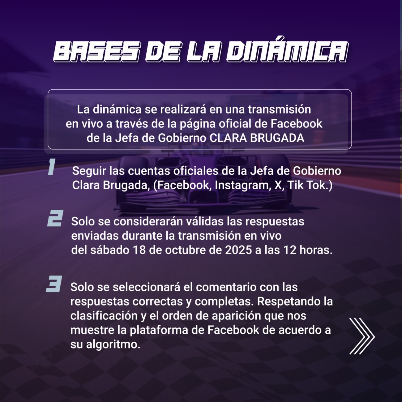 “Amigas y amigos, fans de la #F1, les invito a leer las bases y participar para ganarse uno de los pases dobles que tendremos para que disfruten de este gran evento en la #CapitalDeLaTransformación”, publicó Brugada en X.