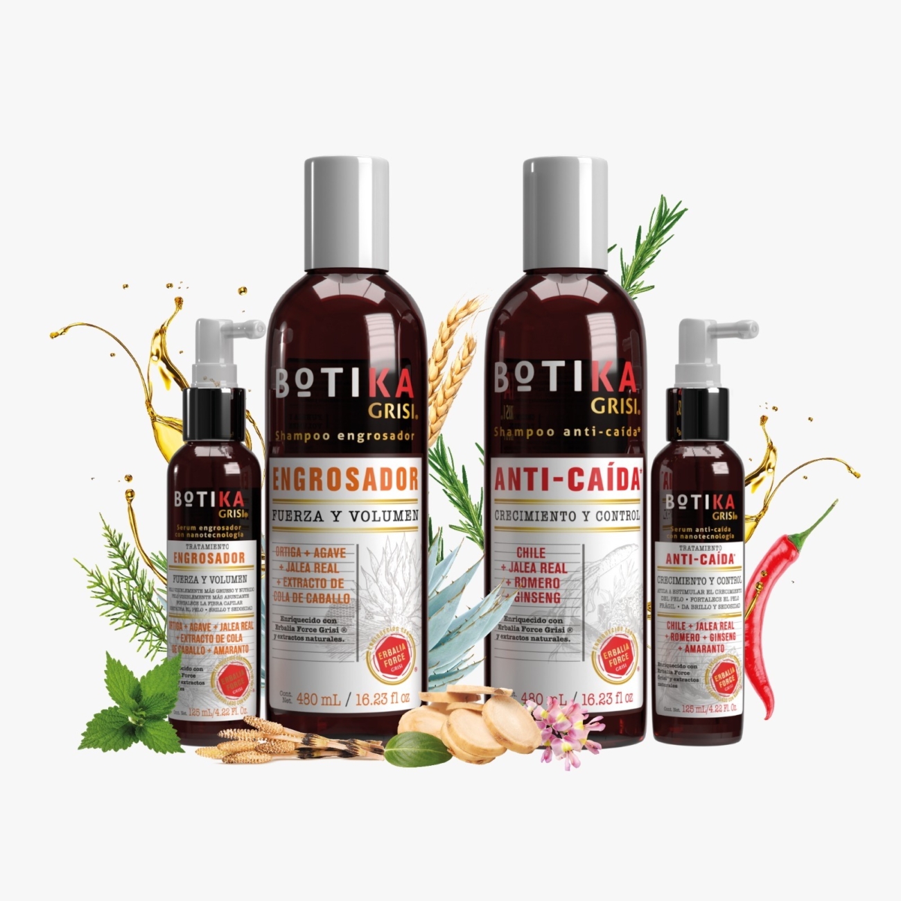 • Shampoo BOTIKA Grisi Anticaída: Este producto promueve un cabello más fuerte y saludable al estimular su crecimiento desde la raíz, prevenir la caída y eliminar el exceso de grasa del cuero cabelludo. Como resultado, el cabello luce brillante y sedoso. Algunos de sus ingredientes esenciales son: chile, jalea real, romero y ginseng.