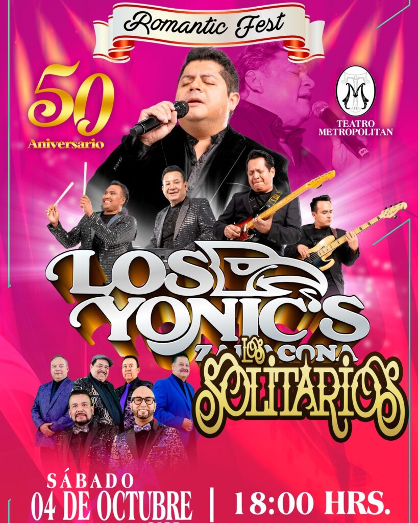 El Teatro Metropólitan volverá a latir con la fuerza del romanticismo mexicano este sábado 4 de octubre de 2025, cuando Los Yonic’s y Los Solitarios unan sus voces en una velada histórica dentro del Romantic Fest, un encuentro preparado para celebrar medio siglo de música, nostalgia y amor. La cita será a partir de las ocho de la noche y los boletos ya están disponibles en el sistema Ticketmaster y en las taquillas del recinto. Bajo la producción de Alto Nivel, promotora incansable comprometida con ofrecer espectáculos de calidad y con profundo valor emocional, esta presentación se perfila como uno de los momentos más memorables del año para los amantes de la balada romántica. Los boletos están disponibles a través de Ticketmaster y en las taquillas del Teatro Metropólitan.